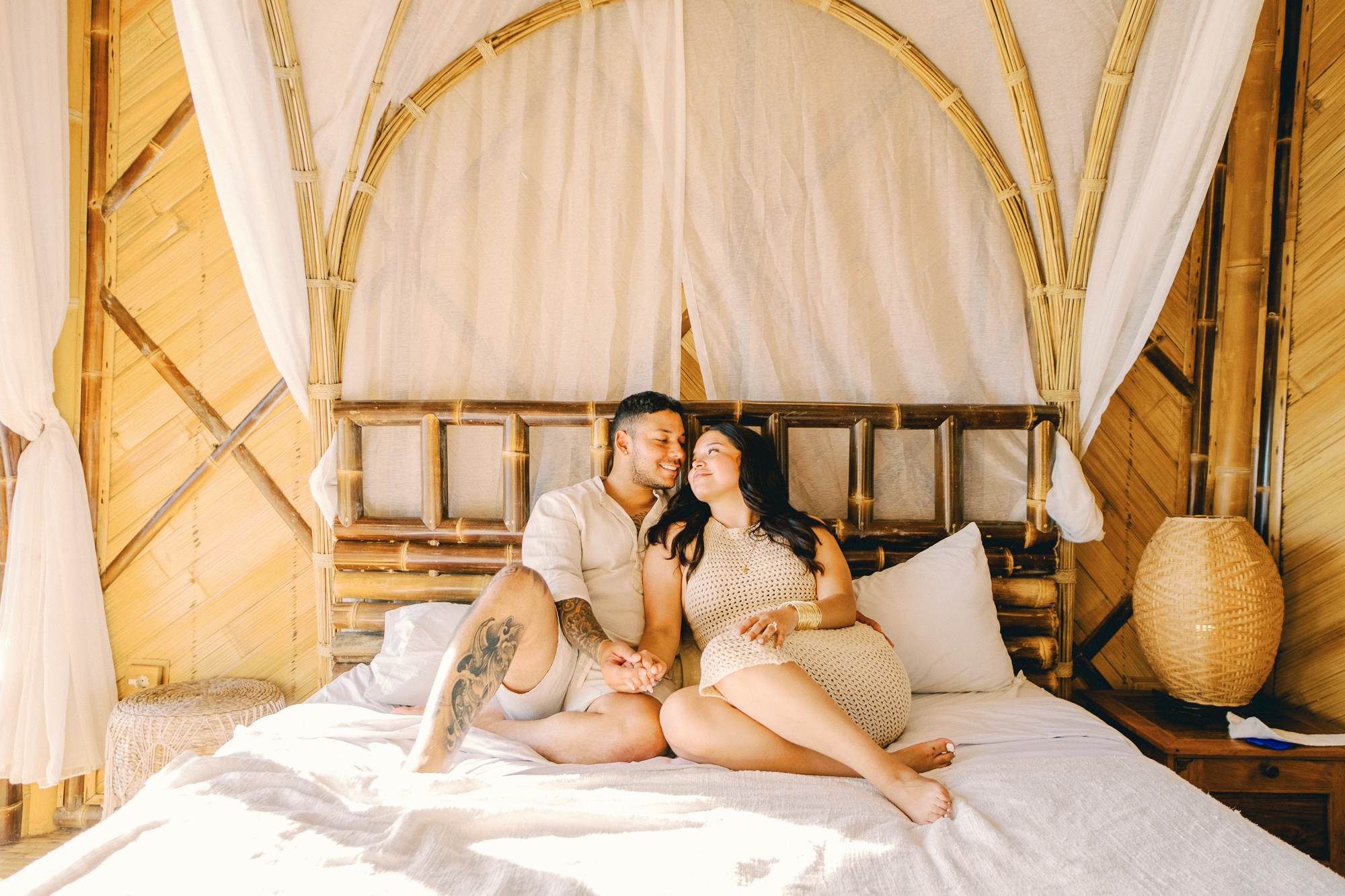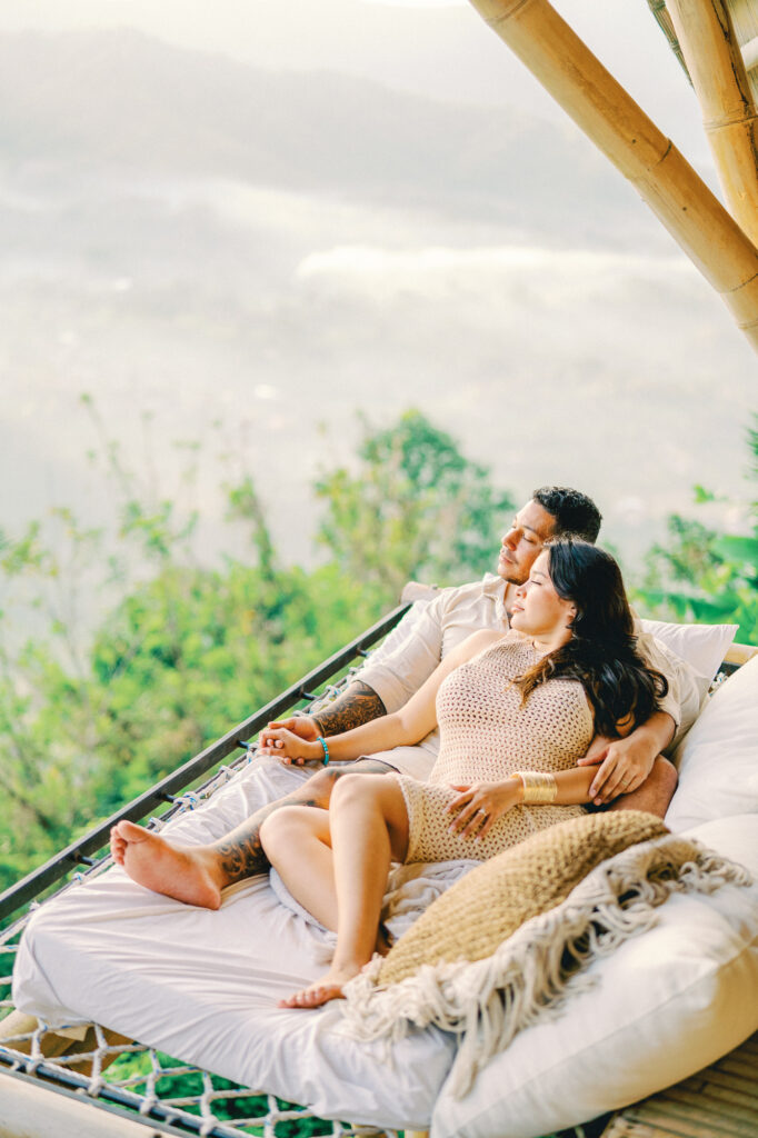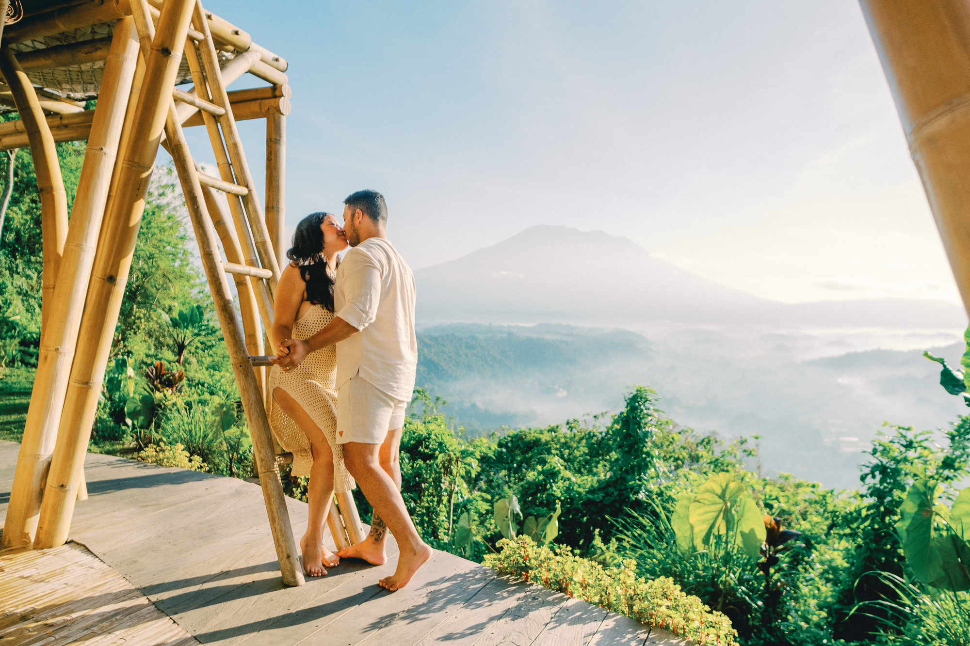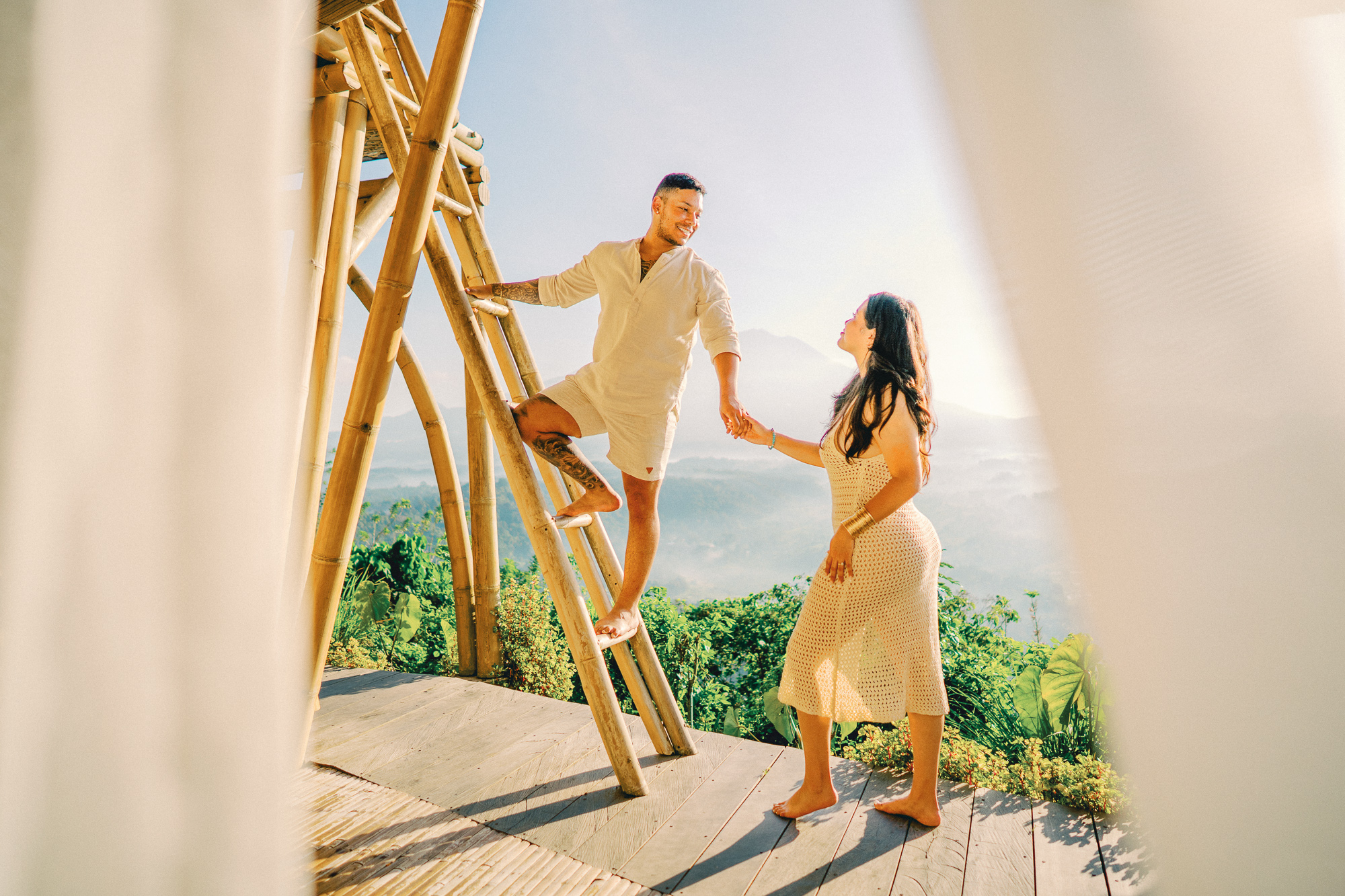 As the first light of day hit the intricate bamboo structure, the valley below was still draped in mist. This shoot was designed to capture the quiet, intimate connection between Ketwig and Kimberly as they woke up to the silhouette of Mount Agung. At Luminare Photo, our goal was to blend fine-art photography with the raw, organic textures of Bali’s most famous bamboo sanctuary.